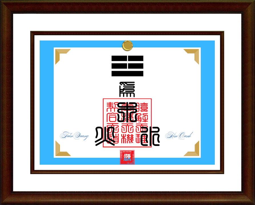 Để tránh nạn sao chép và mạo danh gây ảnh hưởng đến người dùng, hình sản phẩm ở đây chỉ là mẫu để tham khảo về bố cục và hình thức. Đồ hình Thư pháp Kinh Dịch chuẩn cho cặp đôi sẽ dùng quẻ, chữ, và màu sắc khác do học giả Lưu Nguyễn Đào Nguyên soạn căn cứ vào năm sinh và giới tính của cặp đôi. Do đó, khi đặt hàng bạn nhớ ghi năm sinh và giới tính của cả hai vào mục "Ghi chú đơn hàng" để chuyên gia tư vấn lựa chọn chính xác.